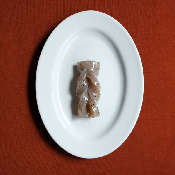 こんにゃくに切り込みを入れてひっくり返す「手綱こんにゃく」を調理中にデザイナー自身が着想した、何ともユニークな作りの商品。