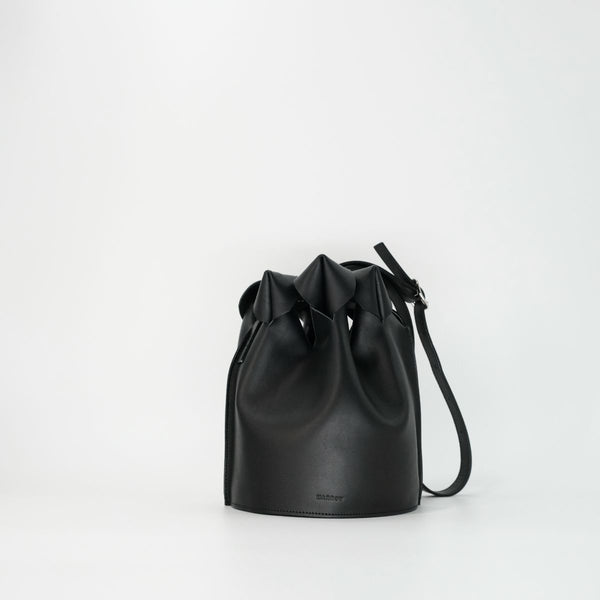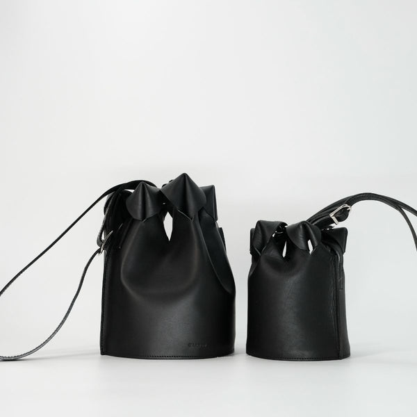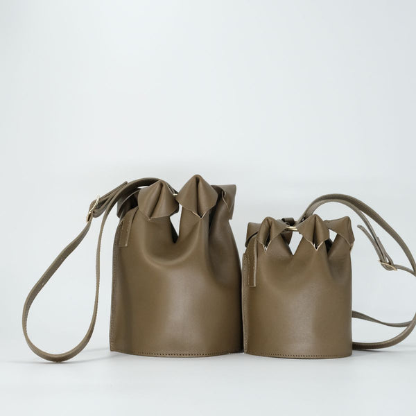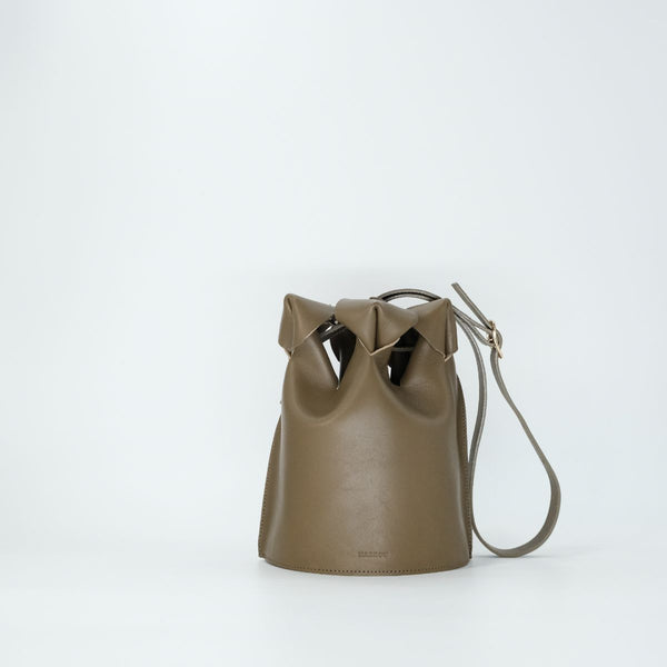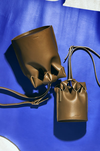 ひっくり返した6つのパーツが真鍮製のリングによってまとめられており、開閉はスナップで簡単にできるため、そのユニークな見た目以上に使い勝手は良く、高さも幅もあるため、ペットボトルを初めひととおりの身の回りのは収納できる。