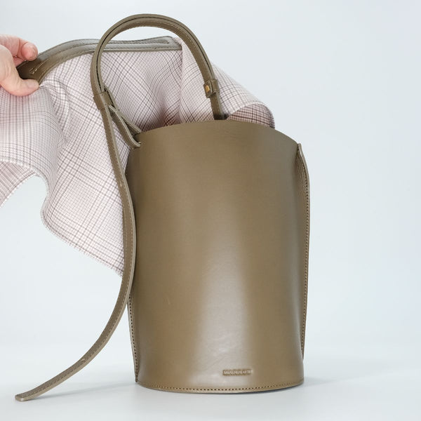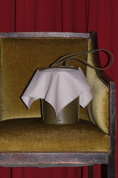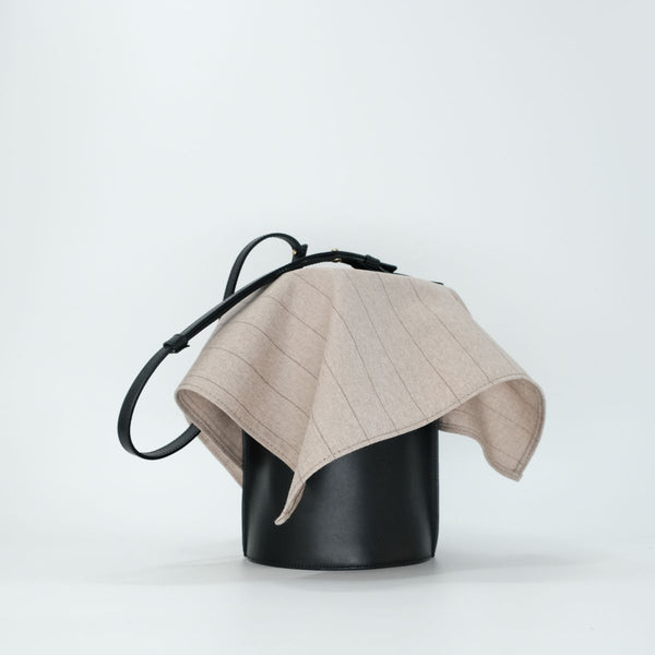 装飾が少なくシンプルな立ち姿がミニマルで潔の良い筒型の「TUBE SHOULDER」に、スカーフをかぶせたような見え方になるフタを付けたユニークなショルダー。