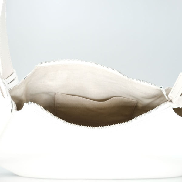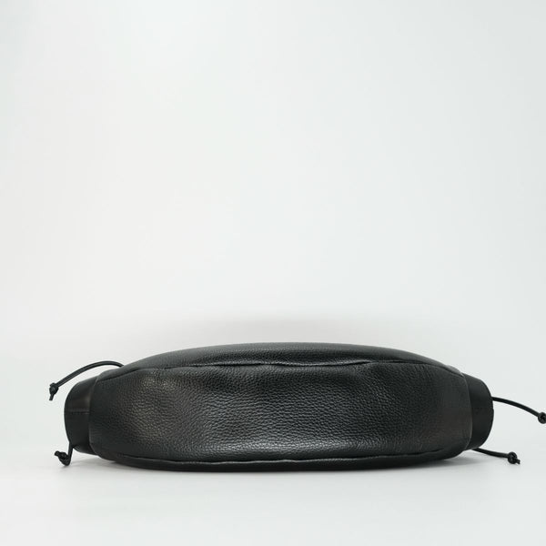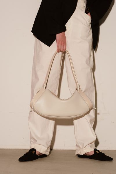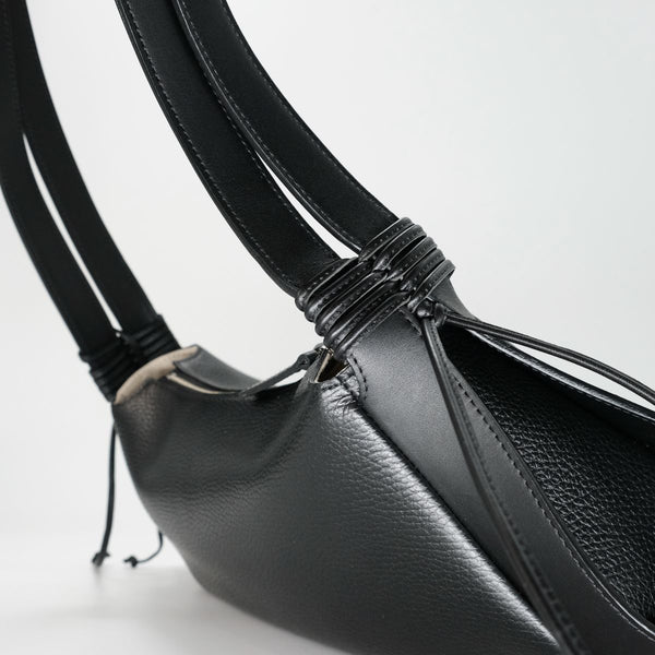 春夏のアイテムによく見られる、編んでいたり、カゴのようなものを作るのではなく、オールシーズン使えるしっかりとした本革のショルダーバッグでありながら、春夏の軽やかな気分を演出できるよう革紐で編み上げている。