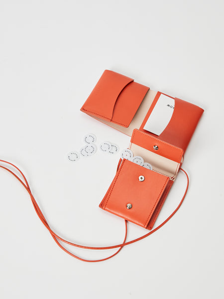 折りたたんだシルエットと首から下げられる紐が特徴的なコンパクトな財布。
